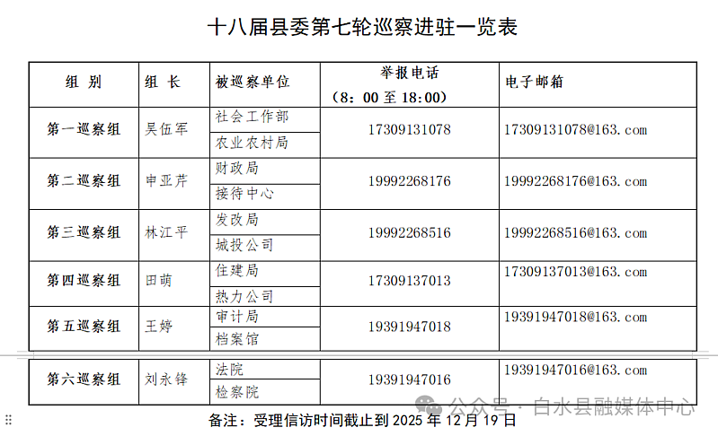 据悉,六个县委巡察组将工作两个月左右,其间设立专门的值班电话和邮政信箱、意见箱,主要受理被巡察党组织领导班子、下一级党组织主要负责人和重点岗位领导干部问题的来电来信来访,重点是关于违反政治纪律、组织纪律、廉洁纪律、群众纪律、工作纪律和生活纪律等方面的举报和反映。巡察组受理信访时间截止到2025年12月19日。